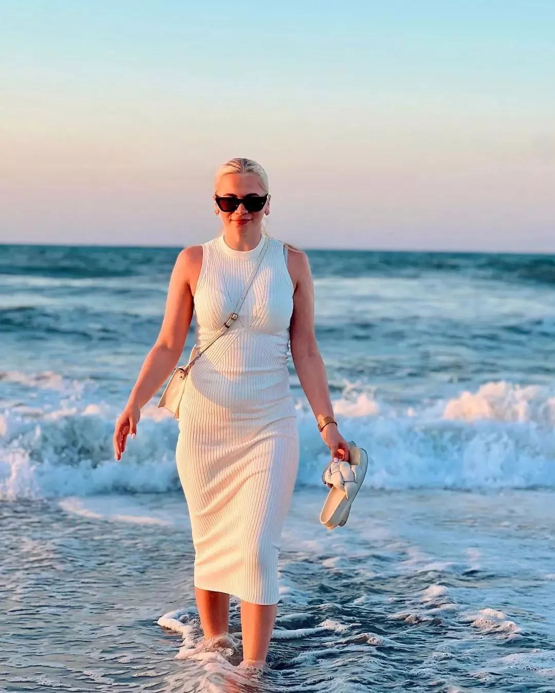 The beach, with its gentle breeze and soothing sound of the waves, was the perfect backdrop for our romantic photoshoot. I wore the ethereal “Essnce Mock Neck Ribbed Knit Sweater Dress“ from Revolve, which billowed in the wind as I twirled in the soft, golden light. Its flowy silhouette perfectly complemented the carefree vibes of the beach.